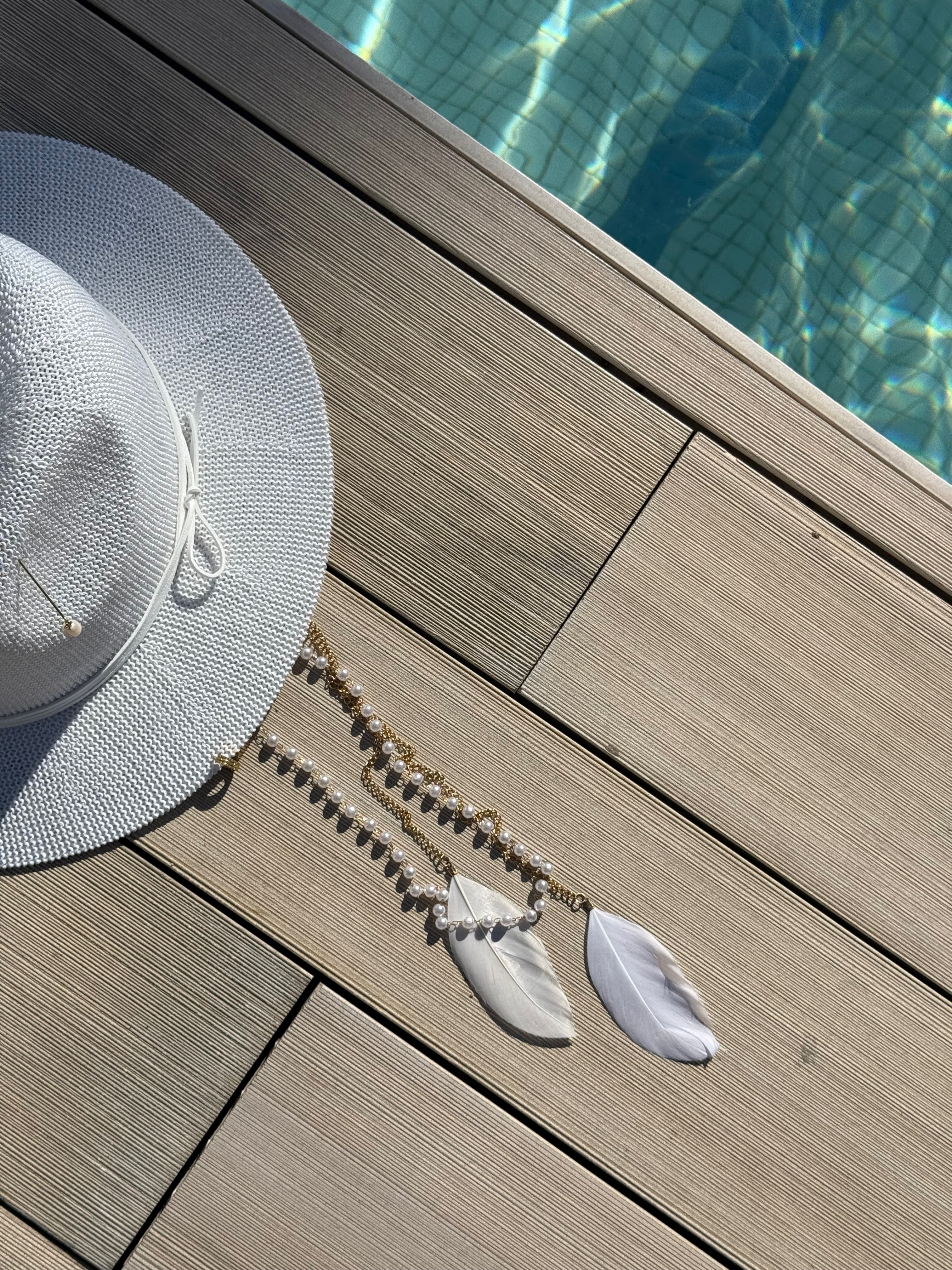 The Saona Hat is a vision of elegance. White as the sand on a hidden beach, it’s adorned with a gold-toned chain with pearls, floating white feathers, and a pearl pin. A perfect blend of sophistication and free-spirited charm.