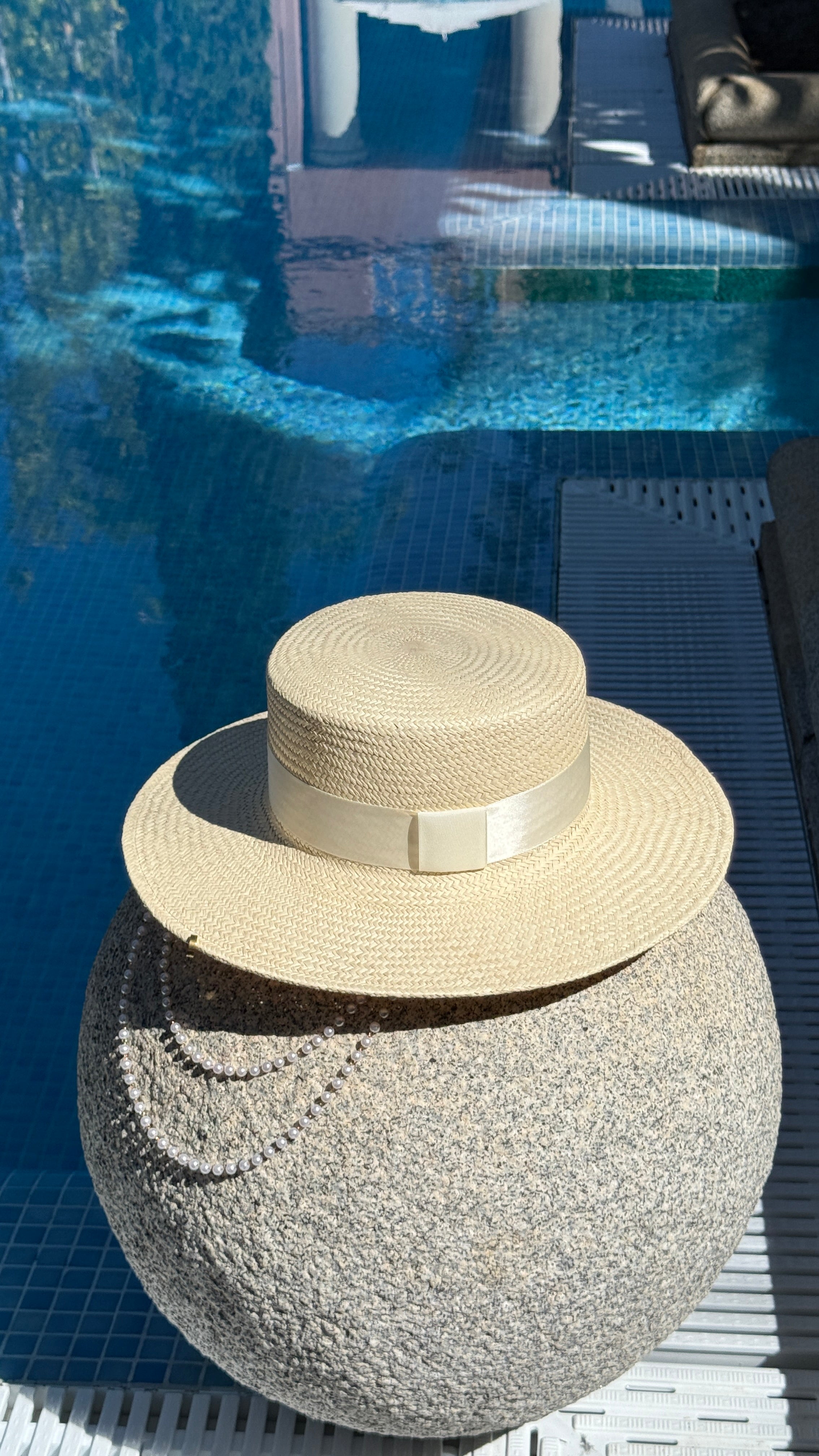 Channel dreamy, sunlit sophistication with the Serenita Hat. Crafted from premium Panama straw, this design is adorned with a detachable pearl chain and gold-toned pins for a hint of vintage romance. The satin band wraps it all together with an elegant flourish, perfect for effortless glamour on sun-drenched beaches or evening getaways.