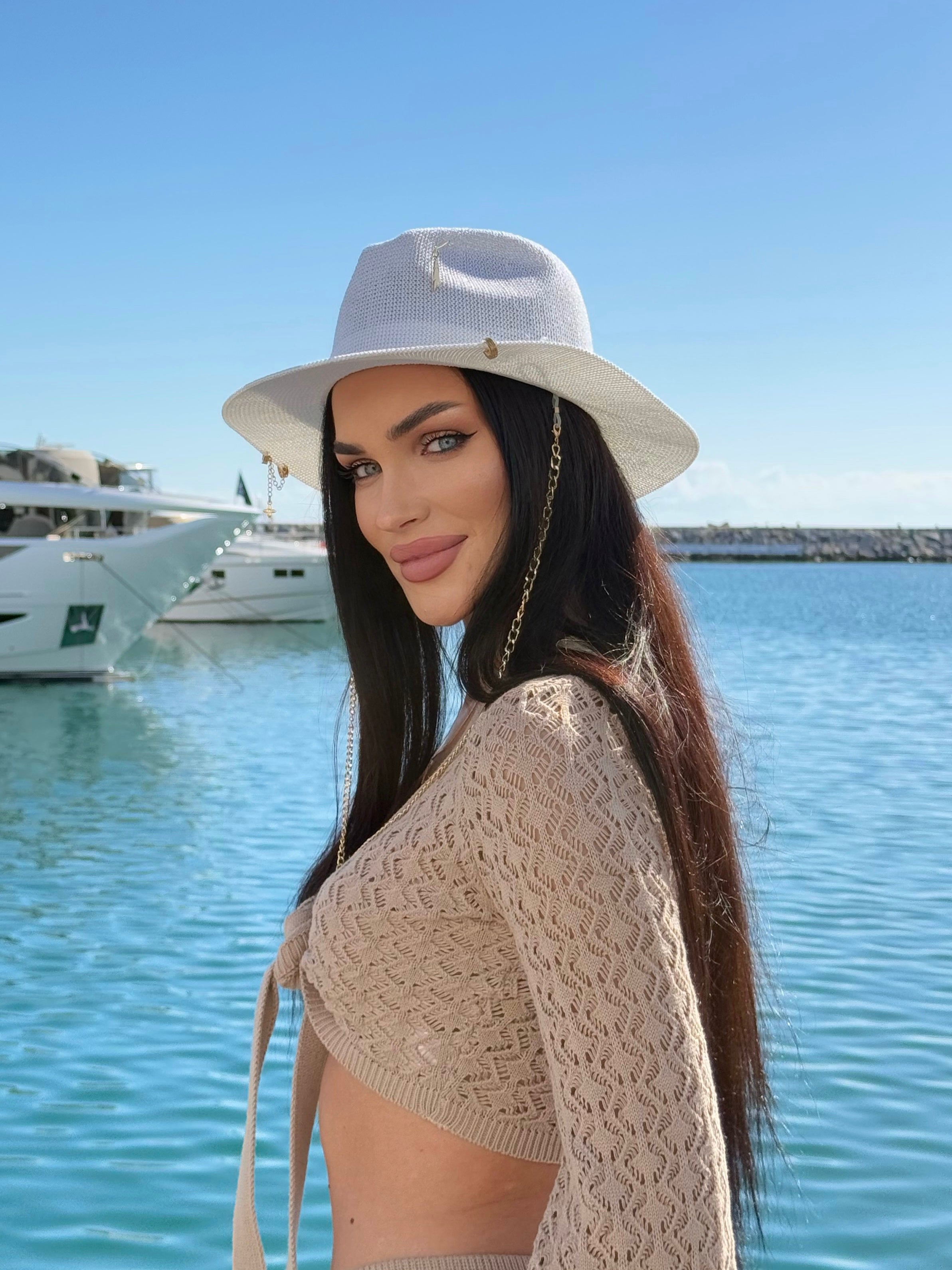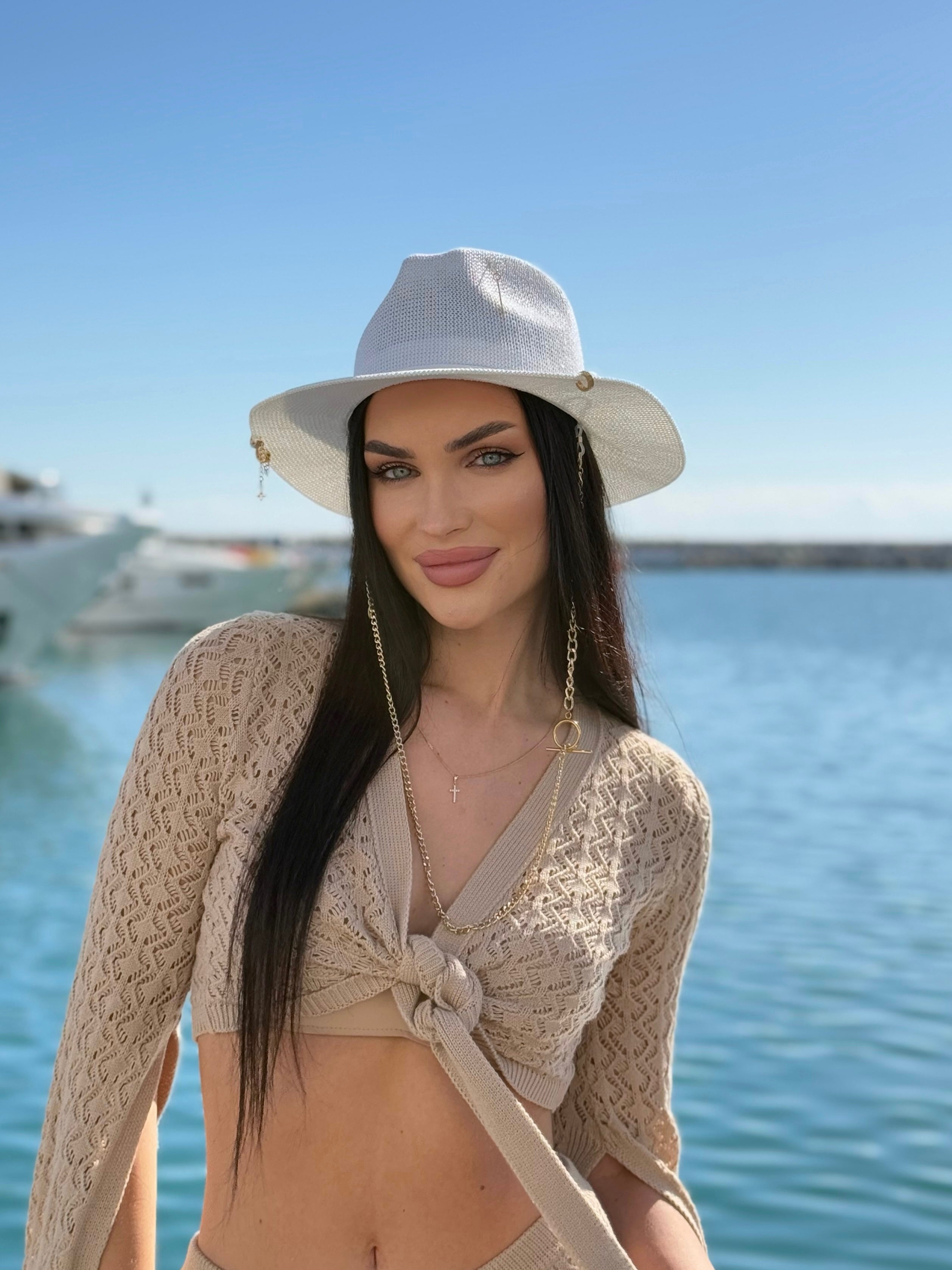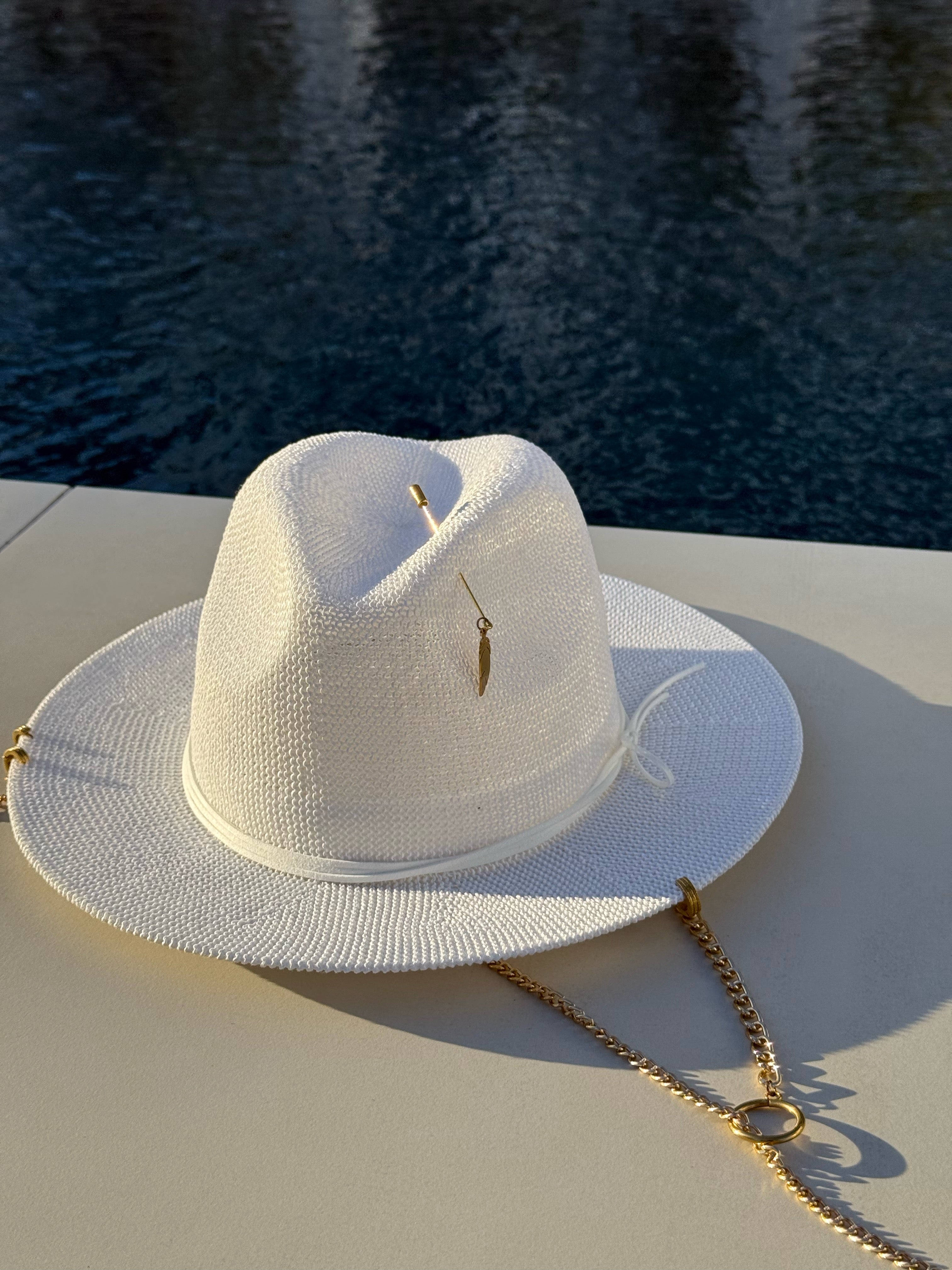 The Sierra Blanca Hat blends bohemian charm with timeless grace. Its crisp white design is elevated with a detachable chain and gold-toned feather pin, a nod to ethereal summer days. Made with high-quality stainless-steel accents, this hat is a radiant choice for a brunch, elegant picnics or coastal escapes.